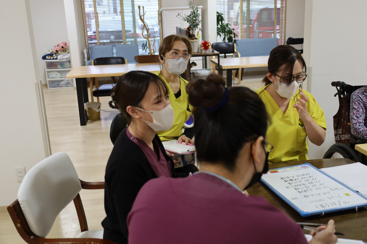 リズムでは、看護師・介護士・ケアマネジャーが、同じ方向を向いて、一人ひとりの暮らしを支えるチームです。